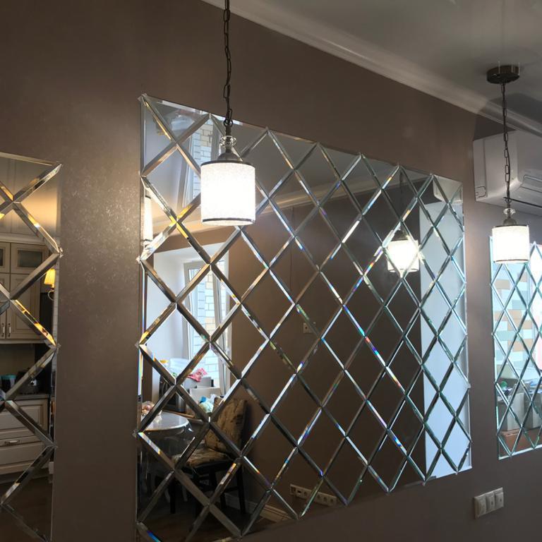 Зеркально панно было сделано из зеркальной плитки 30х30 см, размер панно 255х255 см