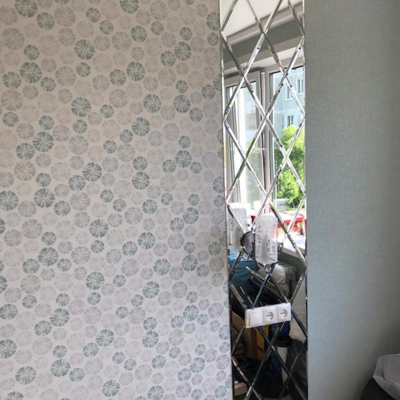 Зеркально панно было сделано из зеркальной плитки 30х30 см, размер панно 255х255 см